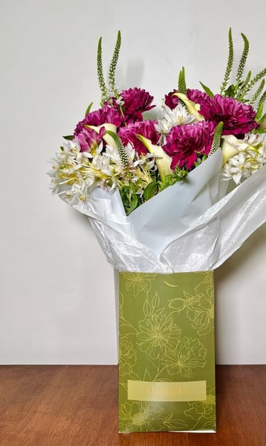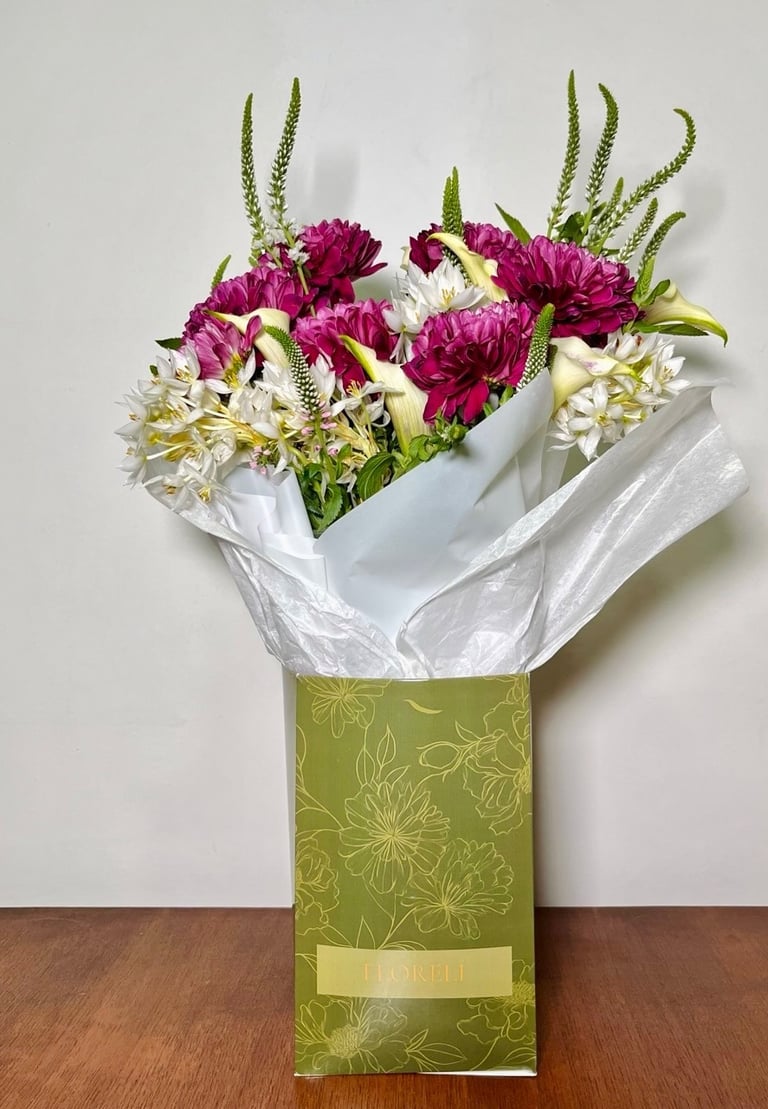 Una oda a la opulencia discreta; Este bouquet con flores de belén, calas únicas y flores de exportación que elevan cualquier espacio.